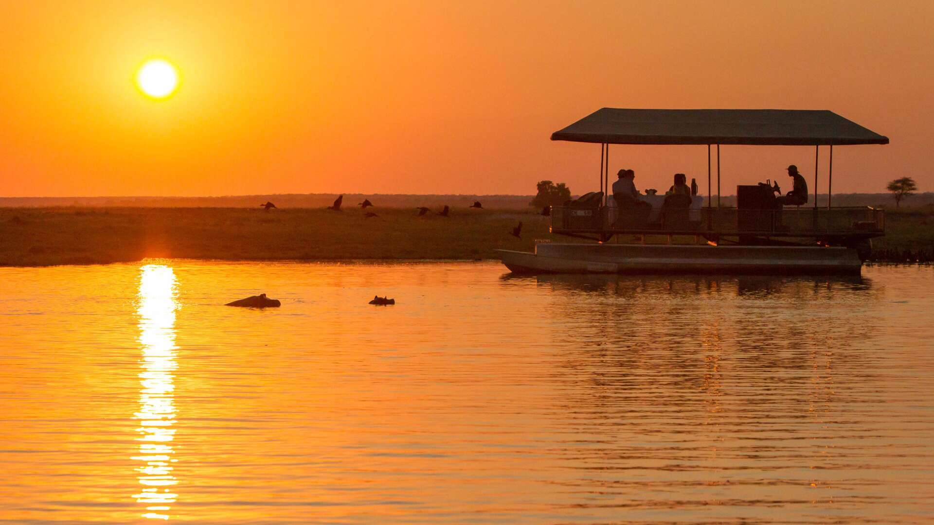On the riverboat safaris, you will head out in the afternoon in small pontoons, which are all electric and solar-powered. Glide silently along the Chobe, heading west away from the other boats, so that you are usually the only boat in the area. You may spot crocodiles and hippos in the water as well as elephants and other animals on the riverbank. There are lots of birds too, including fish eagles hunting from the river. After a couple of hours, you will stop for sundowners in a big open area beside the river, where animals come to drink. Watch the sun set over the river, which is always spectacular – all deep reds and oranges, reflecting on the water below.