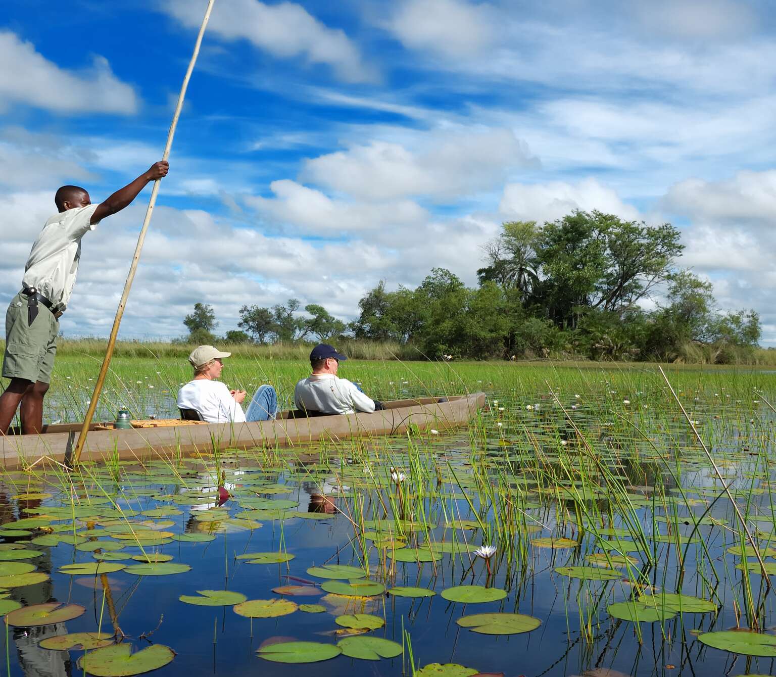 Set your alarm early this morning for an action-packed day in the delta. After an early breakfast, choose to head out on a motorboat to a nearby island for a guided walking safari. Keep an eye out for lions, elephants, buffalo, giraffes and zebras, or even the occasional leopard – this is a paradise for wildlife-lovers. Head back to the lodge for brunch before paddling out on a mokoro (a traditional wooden canoe) in the afternoon. You’ll be poled through the waterways by a guide, passing hippos, crocodiles and colourful birds, before stopping for sundowners in a remote spot as the sun sinks over the horizon. Overnight at Camp Okavango.