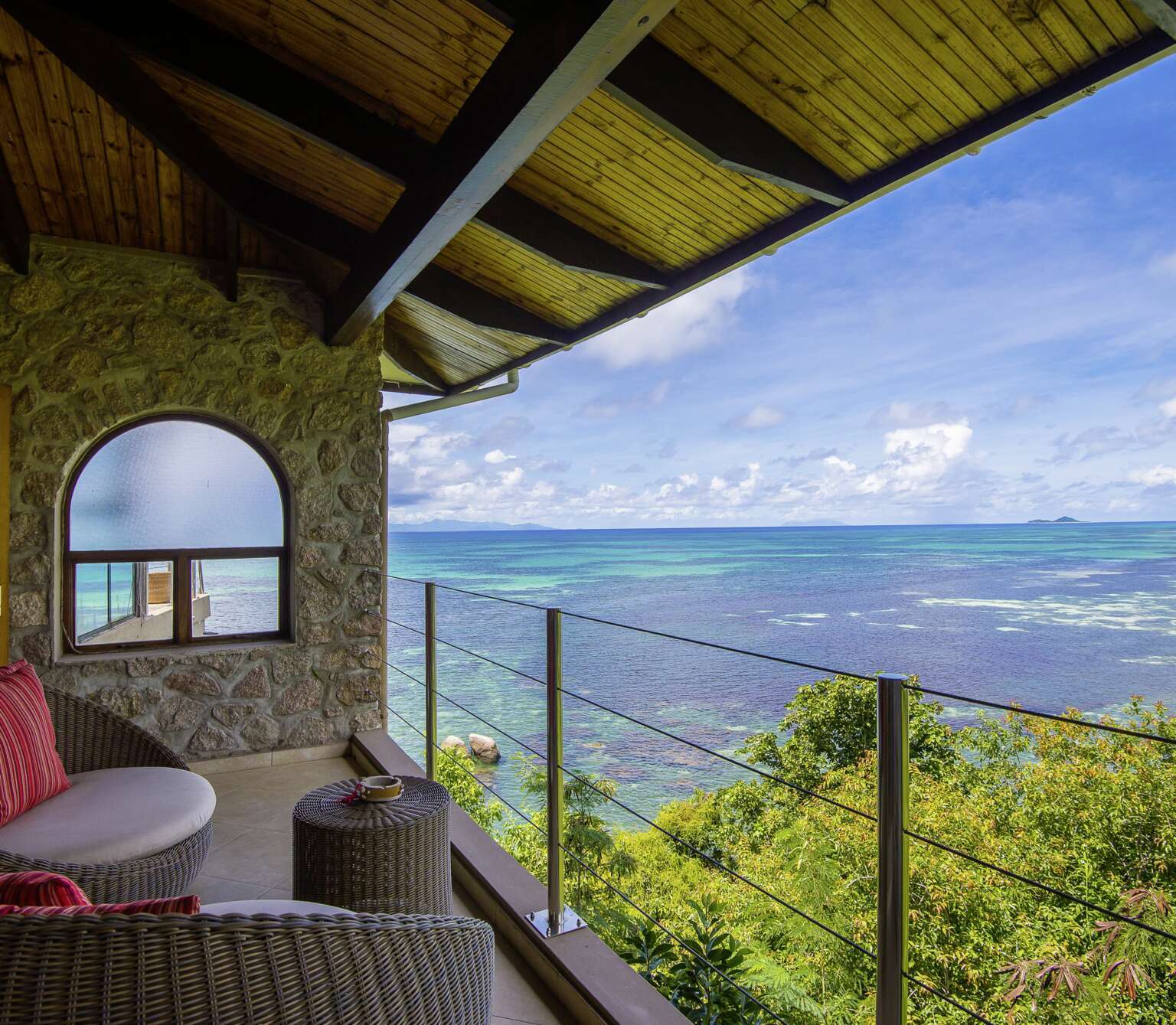 A serene boutique hotel set upon a granite outcrop surrounded by lush foliage overlooking the ocean.