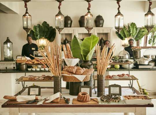 Dining focuses on fresh produce and menus inspired by Arabic, Indian, Persian, Asian and Swahili flavours. Breakfast is served at the resort’s open-air restaurant, the Livingstone Terrace. The Ocean Lounge offers buffet-style lunches from its tandoor oven, salad bar, pizza oven or daily chef’s special menu. Afternoon tea is served in the Chai Lounge. Dinner is either al fresco at the Livingstone Terrace or in the stunning Sultan’s Dining Room.
