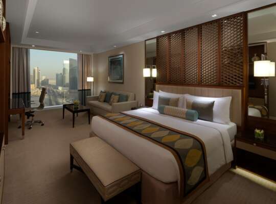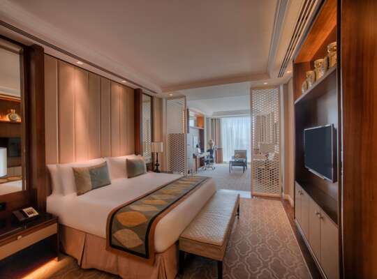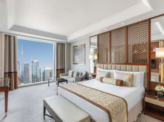 The 296 rooms and suites all feature city views, with the Burj Khalifa visible from Luxury Burj View Rooms. The décor is warm with neutral furnishings and subtle Indian prints, and each en suite comes with a bath tub and Molton Brown toiletries. Families in need of a little more space can make use of the extra sofa bed in the larger Luxury Family Rooms.