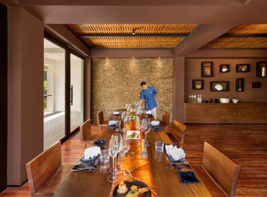 Taj Exotica was built with conservation in mind, ensuring that not a single tree in the entire 46-acres was cut. The villas are made from sustainable plantation timber and placed wherever there was a natural clearing. They have a zero single-use plastic policy and instead guests are given glass bottles that can be refilled from their own water treatment plant. A biogas plant and partial solar power assist with the energy.