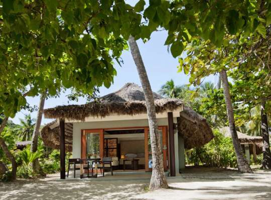 A private island resort with a lagoon-style pool, thatched bures and a family-friendly atmosphere.