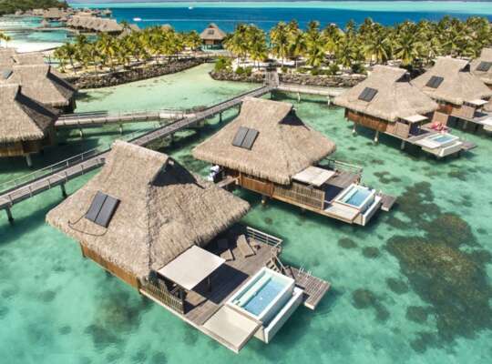 Off the southwest edge of Bora Bora, Conrad Bora Bora Nui sits on Motu To’opua, a private islet cradled between the calm lagoon and the open Pacific. Overwater villas arc into turquoise shallows, while hilltop suites look out across the reef toward Mount Otemanu. The dramatic infinity pool mirrors the sky, and the villas are vast enough to feel like private homes. The mood is relaxed yet refined. Afternoons might be spent paddleboarding with rays or sipping champagne at the beach club, and evenings slip from sashimi under banyan trees to cocktails in the sand. This is Bora Bora with its own rhythm — playful, social, and stylish.