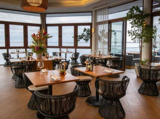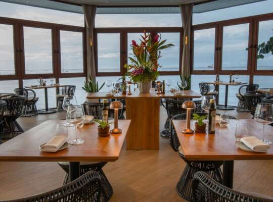 Effortlessly stylish indoor‑outdoor lounge for small plates, fine wines, refined cocktails and Moorea‑framed sunset views.