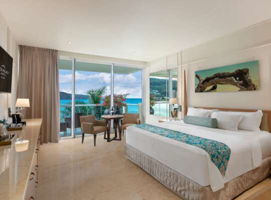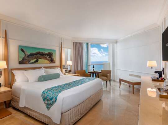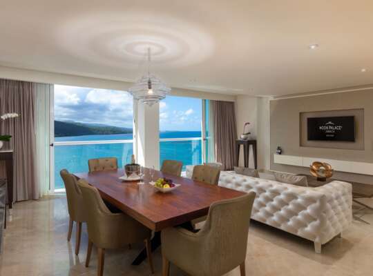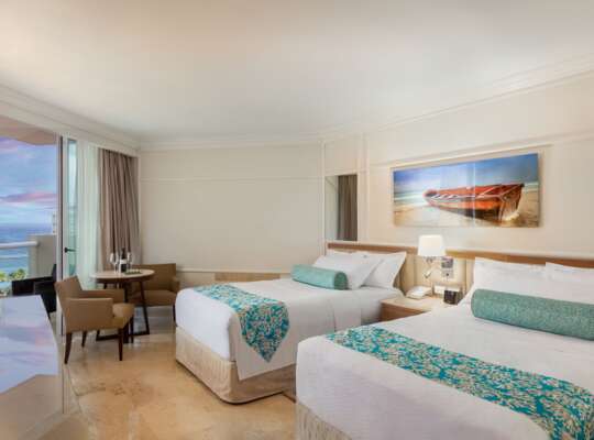 Rooms and suites are spacious, contemporary, and designed for comfort. Expect sleek finishes, a fully included minibar, liquor dispensers, whirlpool tubs, a nightly turndown service, and a welcome bottle of wine to set the tone from day one. Family rooms typically feature two interconnecting rooms, giving parents and children space to relax comfortably. Higher category suites add sea views, larger terraces, and separate living areas for extra room to unwind.