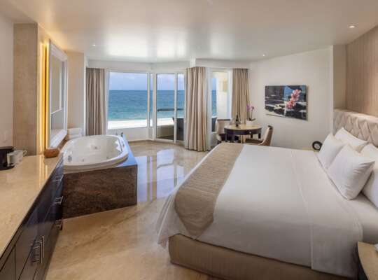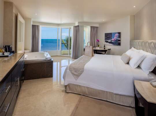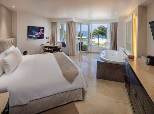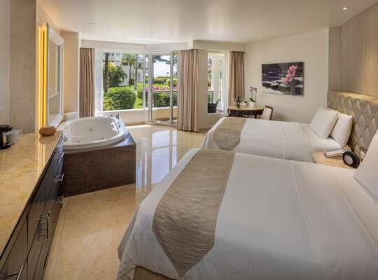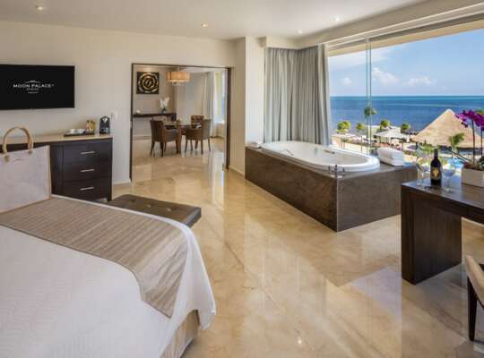 Rooms at Moon Palace Nizuc are spacious and carefully designed, with each one featuring a double whirlpool tub and a private balcony or terrace. The layout makes smart use of space, with storage that’s built in rather than an afterthought so you can properly unpack. Families can book connecting rooms with an extra whirlpool tub for zero squabbles about whose turn it is, while couples often choose suites for more space and privacy.