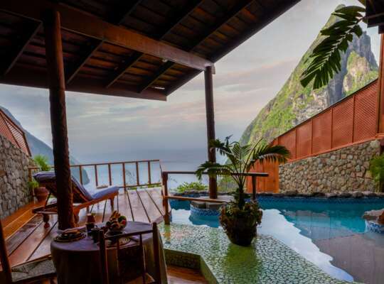 A romantic hideaway in a spectacular hillside and beach setting near the Pitons