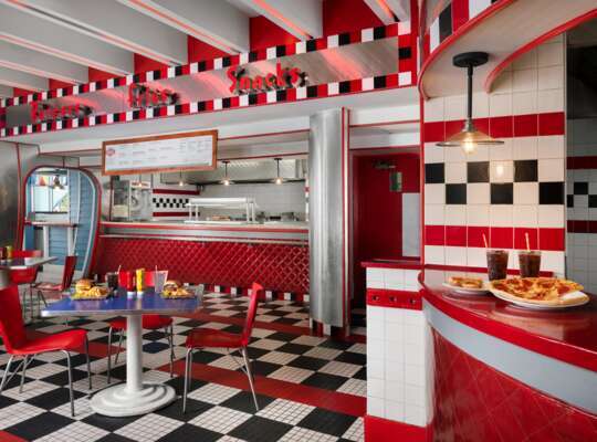 Retro-style dining with burgers, snacks, and sweet treats that keep kids and adults happy.