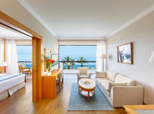 The 111 rooms are decorated with neutral colours and light wood furnishings and each features a balcony with views overlooking the surrounding area, the gardens or the pool. Some have a limited sea view while others have panoramic views of the water. The Junior Suites are a spacious choice and feature an inland view. For a separate living room and a balcony opt for one of the One Bedroom Suites which have inland views or limited sea views and front sea views for a supplement. The Executive Suites are a real treat as they have their own private plunge pool.