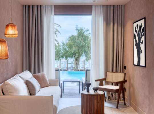 Domes of Corfu is a chic, bohemian retreat where contemporary elegance meets the timeless beauty of the Ionian coast. Nestled on a golden-sand Blue Flag beach and framed by lush pine forests, this serene sanctuary feels worlds away from everyday life, yet Corfu Town’s vibrant tavernas and historic streets are just a short drive from your door.