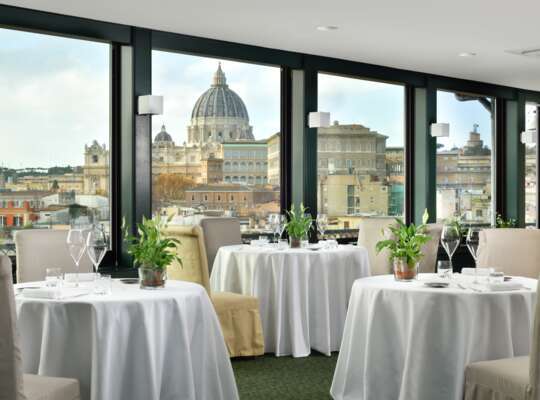A panoramic rooftop restaurant serving Mediterranean and Italian cuisine with open views towards the dome of St Peter’s Basilica.