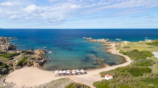 Terracotta roofs, pale sand, and very clear water — this is Sardinia done properly.