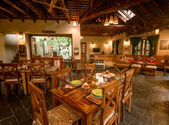 The food at the lodge is home-cooked and made with produce from the organic gardens, they even press their own oils. Guests particularly enjoy the Kangra Dham, which is a 14-dish thali and a regional speciality made with spices on a wood fire.