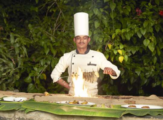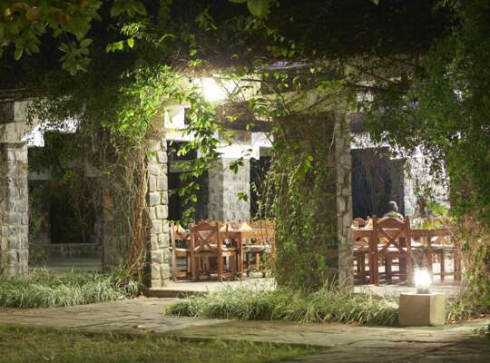 The stone and thatch central building serves Indian and international cuisine although most evening meals are served under the stars around the campfire.