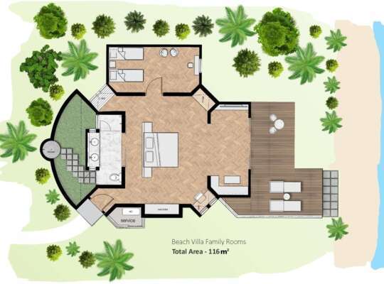 You’ll always only be a few steps from the sandy beach or crystal-clear waters of the lagoon at this luxury resort.