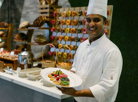 The main restaurant is set in lush foliage. It offers international buffet dining, live cooking stations and signature specialities with a twist.