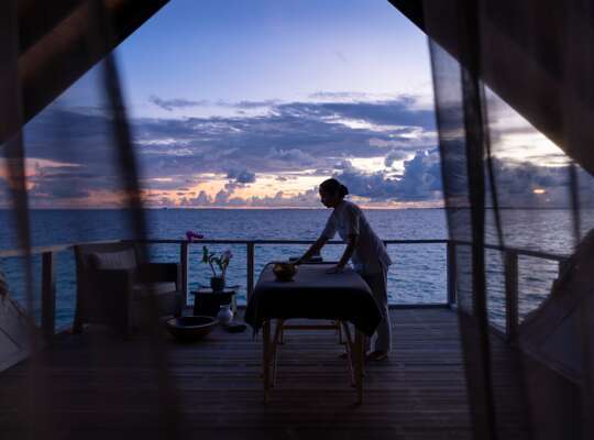 The Spa at Velassaru Maldives has ten overwater treatment rooms. The Velassaru Ritual is the classic experience – a choice of three or four treatments, including a lagoon coral scrub, coconut oil massage and island radiance facial.
