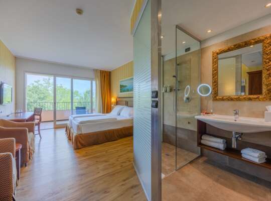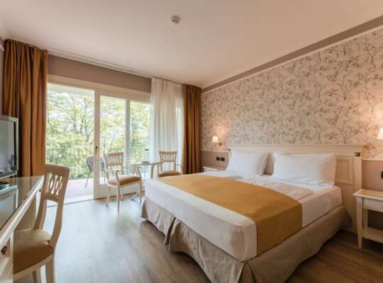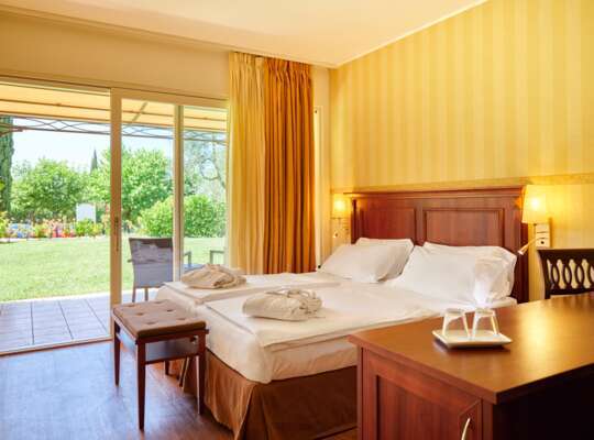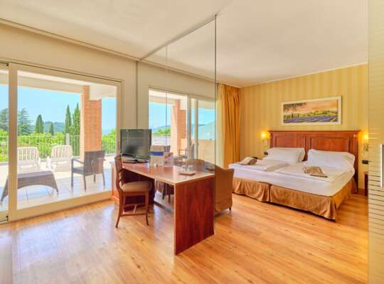 Rooms and suites go for warm, holiday-friendly comfort with soft tones, wood floors, and balconies or terraces in many categories. Some have been renovated in a more modern style, while others keep a simpler classic look. The key is choosing based on how you plan to use the room. If it’s mostly sleep and shower between lake days, the doubles do the job well. If you like proper downtime (post-swim reading, a pre-dinner drink, or the classic “what are we doing tomorrow?” planning session) the Junior Suites and Suites give you extra living space and larger outdoor areas.