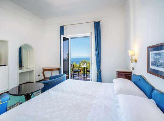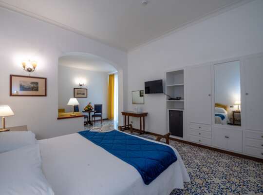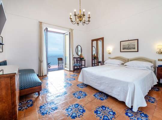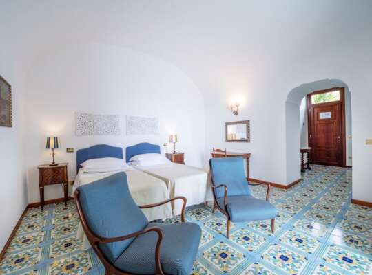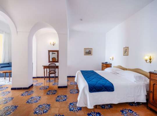 Rooms are traditional and bright, with a classic Amalfi playbook of cool blues, crisp whites, hand painted tiles, and light fabrics. It’s all very coastal and easy going, with the sea doing most of the heavy lifting when it comes to décor, especially once you step out onto your private terrace. Bathrooms are bright and perfectly functional, but not especially modern in style — think more traditional tiling than spa-like minimalism. If you know you’ll want to sit out with a drink, read, or sprawl in the sun after a swim, it’s worth considering upgrading for the larger terraces.
