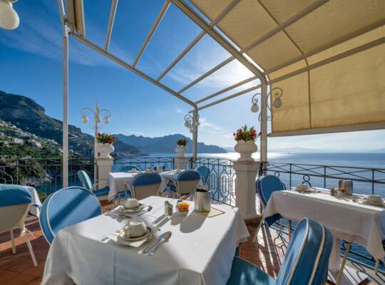 There’s one main panoramic restaurant for breakfast, lunch, and dinner, with a half board option and a daily menu that changes regularly. Expect Mediterranean cooking with an Amalfi Coast slant, local seafood, seasonal produce, and fresh pasta. During the day, the pool bar handles lighter lunches, snacky bits, and all-important cold drinks between dips. If you’re in the mood to head out, Amalfi’s restaurants are a short drive or shuttle ride away.