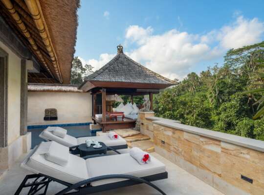 A stylish hilltop retreat, an award-winning pool and breathtaking rainforest and rice paddy views.